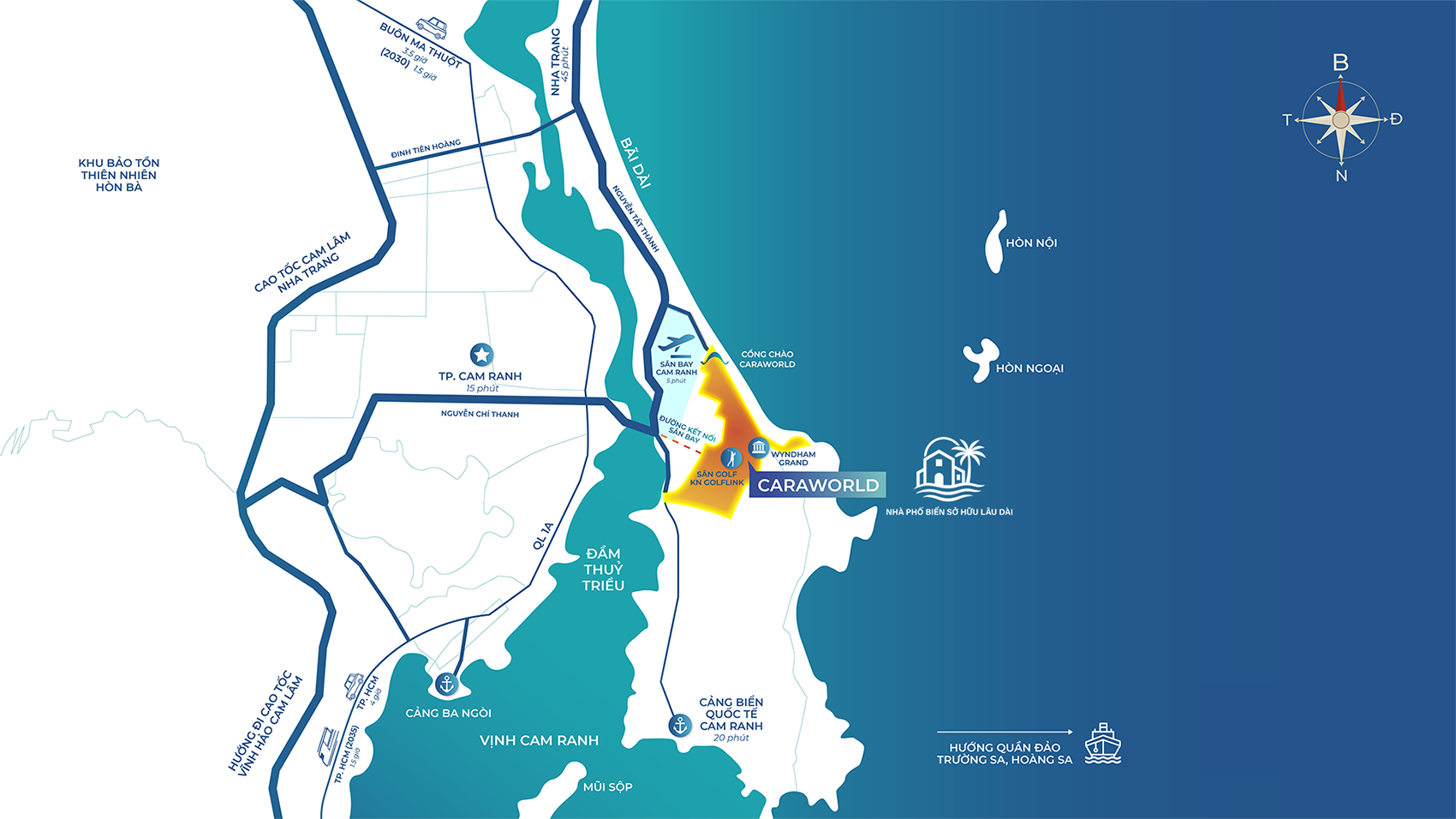 Tọa lạc trên cung đường Bãi Dài – Cam Ranh, CaraWorld kết nối trực tiếp tam giác du lịch: Nha Trang – Cam Ranh – Bình Ba.